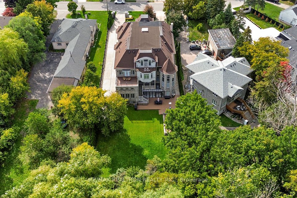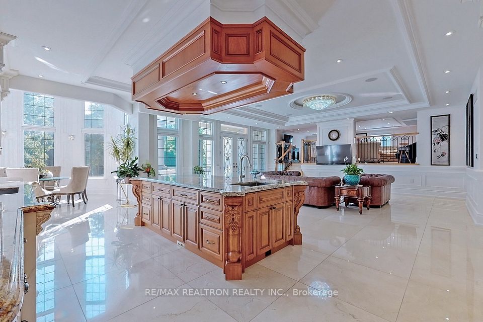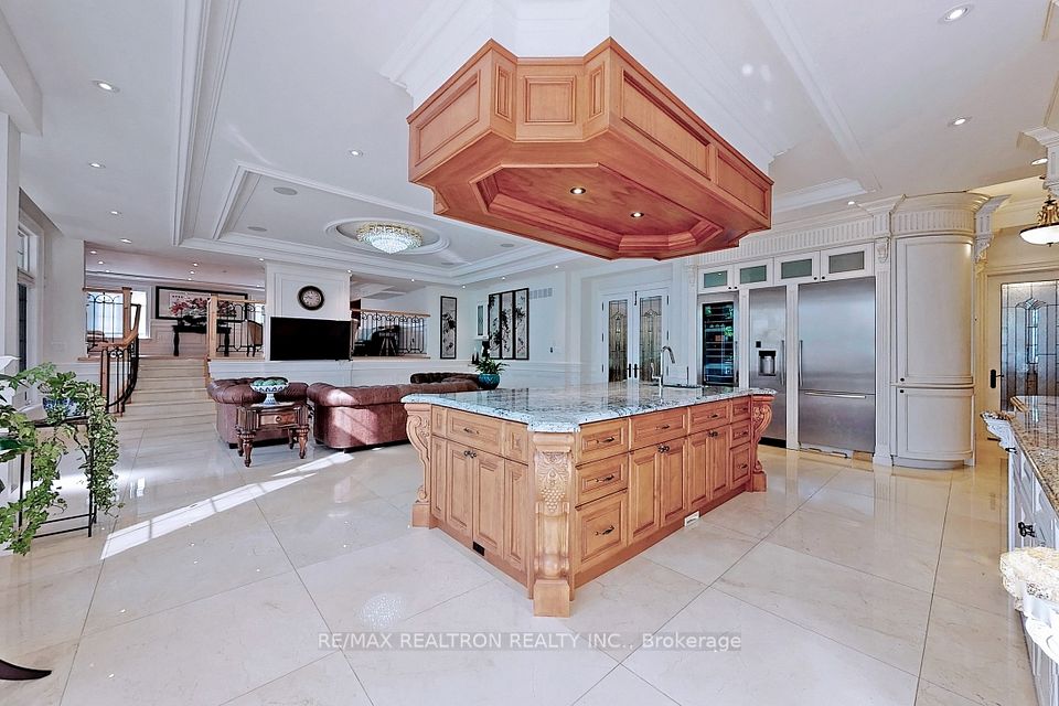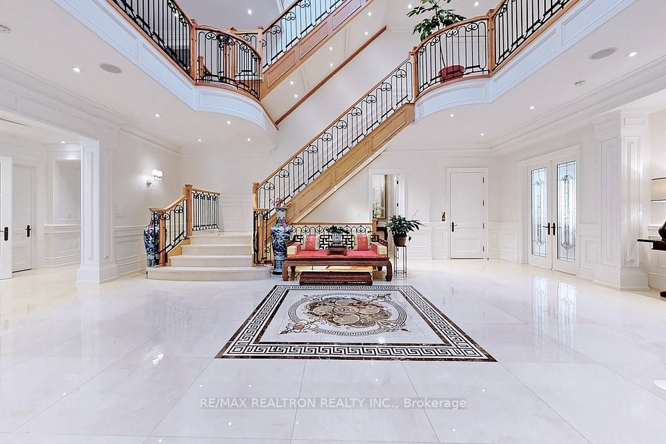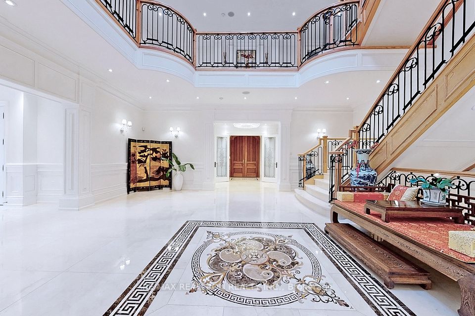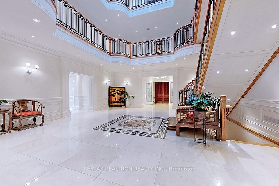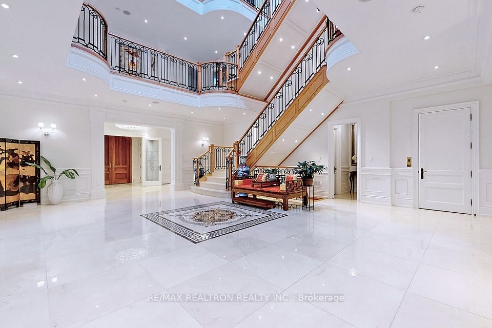 An architectural triumph in prestigious 'South Richvale', this estate commands attention from the moment you arrive. A gated circular drive with 4-car garage introduces the residence, while a stately stone portico entrance way with columns sets the tone for timeless refinement. A soaring 40-foot grand atrium foyer crowned by a cathedral skylight delivers an unforgettable first impression. Bathed in natural light, the space rises dramatically, framed by oak staircases w/ intricate iron spindles, wood paneling, wainscoting, crown molding, and polished marble and granite finishes every detail chosen to embody timeless elegance. The main level is both luxurious and functional. At its heart lies a gourmet chefs kitchen with cathedral breakfast area, oversized island, and top-tier stainless steel appliances, complemented by a full prep kitchen. Formal and casual living spaces flow seamlessly framed by 10 & 11 foot ceilings w/ built-in speakers, while a paneled natural wood office provides a refined workspace. Dual powder rooms enhance convenience and entertaining. The second and third levels host seven expansive bedrooms, each w/ ensuite, marble finishes, and walk-in closets, many opening onto private balconies. The master retreat indulgences with two heated en-suites, two custom walk-in closets including a marble dressing room, sitting area, and fireplace. The upper level also includes an apartment-style suite and a dedicated prayer room with private washroom. The lower level is designed for leisure and wellness. A home theatre and karaoke lounge with projector screens invite entertainment, while a wine cellar with heated floors and full kitchen enhance gatherings. A spa sanctuary features sauna, jacuzzi, heated floors, and multiple washrooms, complemented by a nanny suite and second laundry for multi-generational living. Steps from Yonge Street and minutes to Hwy 407, this estate unites architectural brilliance, modern comfort, and an unmatched sense of grandeur.