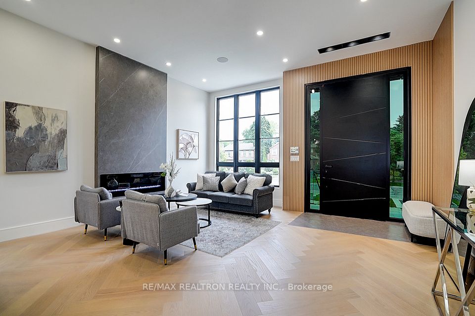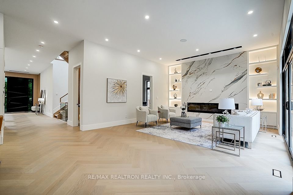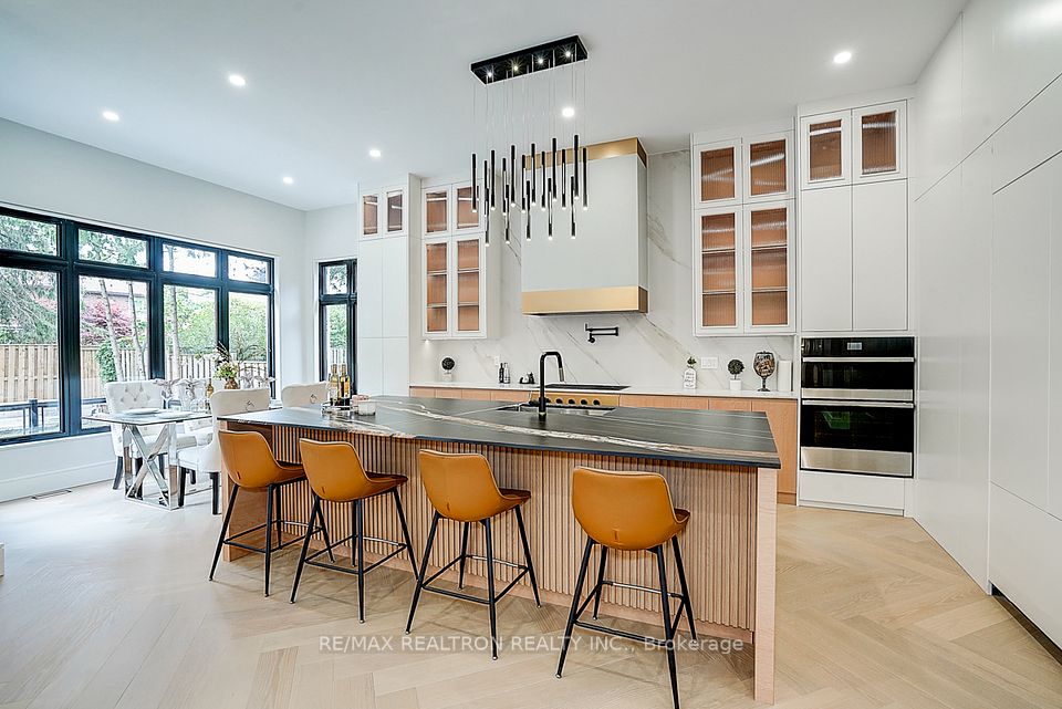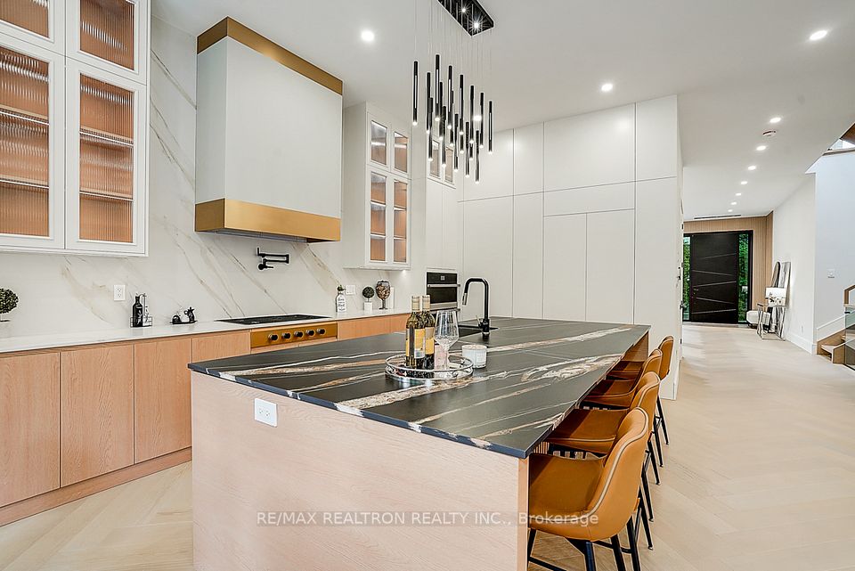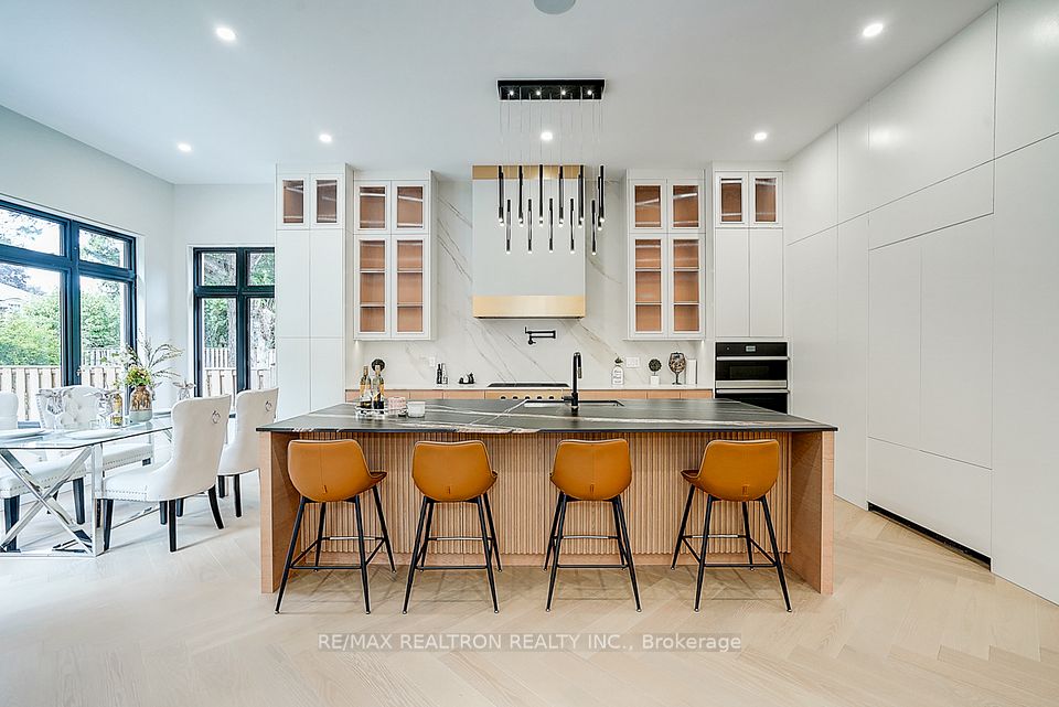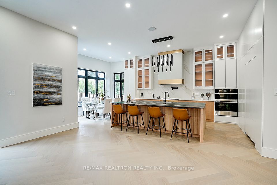 Your search ends here! Discover this brand-new, custom-built luxury home in the prestigious Unionville neighborhood, just minutes from Main Street Unionville and Toogood Pond. With over 5,500 sq ft of total living space and parking for up to 8 vehicles, this residence sits on a professionally landscaped lot with over $100,000 invested in premium hardscaping, including large-format Unilock interlock and a natural limestone front porch. Step inside to 11-ft ceilings, premium French chevron engineered hardwood flooring, and anti-fingerprint glass railings. The home is bathed in natural light through floor-to-ceiling French windows and a skylight above the grand staircase. The gourmet kitchen is a showstopper, featuring full-height custom cabinetry with sintered stone backsplash, massive social island, Jennair built-in fridge, steam oven & microwave, Wolf gas cooktop, Bosch dishwasher, and a pot filler. A second enclosed kitchen with a window is discreetly tucked away, added functionality for serious cooks. Upstairs, enjoy 9-ft ceilings, a luxurious primary suite with a walk-out balcony, curveless sunny shower, custom walk-in closet with skylight, heated flooring, and a smart toilet. All additional bedrooms are ensuite, with heated floors and smart toilets in bathrooms. The finished basement includes 9-ft ceilings, a spacious rec room, built-in home theatre, guest suite, and sunken garden walk-up patio perfect for entertaining or multigenerational living. Comfort and convenience are ensured with dual HVAC systems, built-in sound system in main floor, a smart security system and high-efficiency insulation windows throughout. A rare find in Unionville luxury, function, and timeless design come together.